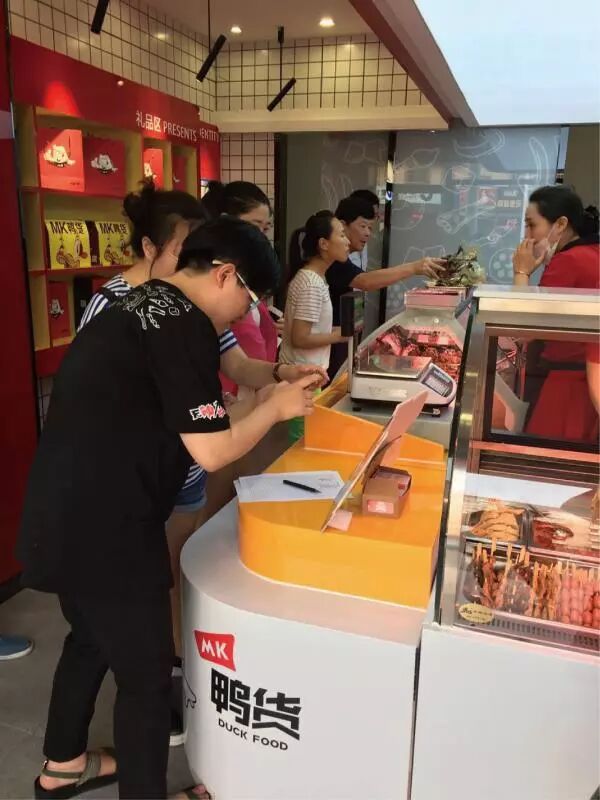 而在天津塘沽新区,就有一家店生意火爆,不论早上晚上,都有很多顾客排队购买鸭货。一个收银,一个快速称重打包,尽管该门店货品量是其500米内另一家品牌卤味熟食店的2~3倍,也常常会出现供不应求的状况。正是这么一家约10平米的门店,没有桌椅,装修简单,一年收入却近40万元!如此丰厚的利润,也引得店老板不少朋友亲戚跟他打听加盟开店赚钱的路子,并通过他找到MK鸭货总部申请加盟开店。