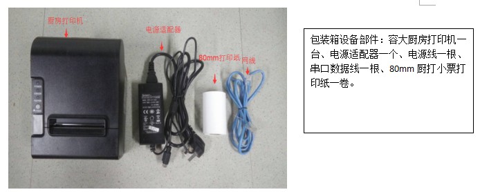 您连接好后,开启打印机装纸盖将打印纸装好,同时按住走纸(FEED)按钮打开电源开关,厨房打印机打印一串参数小票,其中包含厨房打印机IP地址、端口号及波特率。